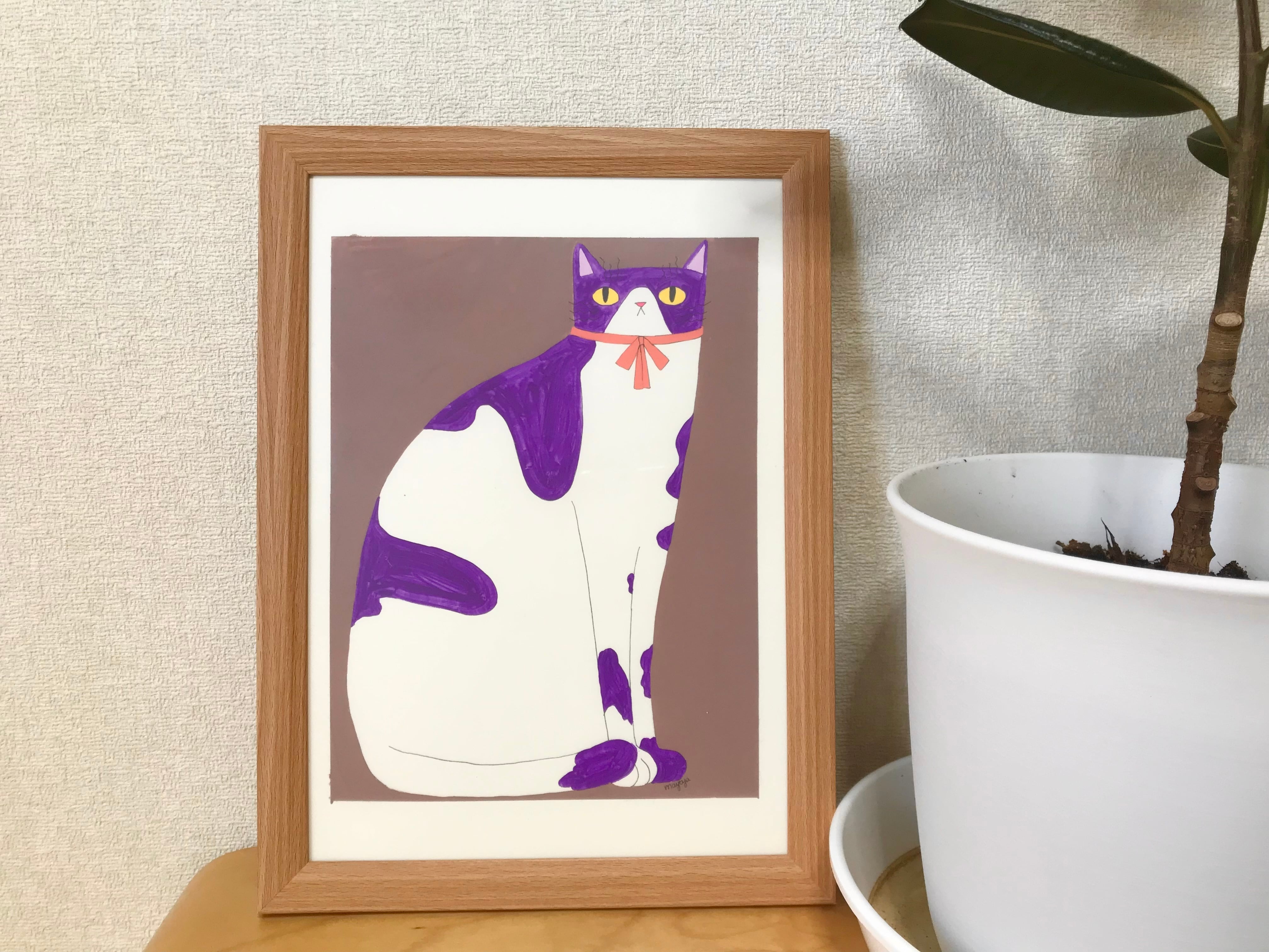 【A4原画】紫斑猫【額縁込み】